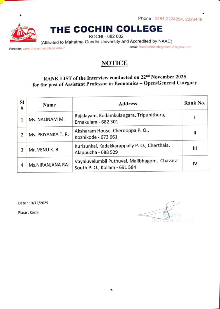 കൊച്ചിൻ കോളേജിൽ 2025-26 അധ്യയന വർഷത്തേക്ക് ഫിസിക്സ് ,കെമിസ്ട്രി, ബോട്ടണി, കൊമേഴ്സ്, മാനേജ്മെൻറ്, ഇക്കണോമിക്സ്,ഹിന്ദി എന്നീ വിഷയങ്ങളിലേക്ക് അതിഥി അധ്യാപക ഒഴിവുകൾ ഉണ്ട്. ഇതിനായുള്ള വാക്ക് – ഇൻ- ഇൻറർവ്യൂ താഴെപ്പറയുന്ന തീയതികളിൽ നടത്തുന്നതായിരിക്കും. കോമേഴ്സ്, മാനേജ്മെൻറ് 3/05/2025 , ബോട്ടണി, ഫിസിക്സ് 20/05/2025, ഹിന്ദി, ഇക്കണോമിക്സ് 22/05/2025, കെമിസ്ട്രി 29/05/2025 .അപേക്ഷകർ യുജിസി റെഗുലേഷൻ 2018 പ്രകാരം യോഗ്യതയുള്ളവർ ആയിരിക്കണം. ഇവരുടെ അഭാവത്തിൽ 55% മിനിമം മാർക്കോടുകൂടി ബിരുദാനന്തര ബിരുദം ലഭിച്ചവരെയും പരിഗണിക്കുന്നതാണ്. എറണാകുളം കോളേജ് വിദ്യാഭ്യാസ ഡെപ്യൂട്ടി ഡയറക്ടറുടെ കാര്യാലയത്തിൽ ഗസ്റ്റ് പാനൽ രജിസ്റ്റർ ചെയ്ത ഉദ്യോഗാർത്ഥികൾ സർട്ടിഫിക്കറ്റുകളും അനുബന്ധ രേഖകളും ആയി നിശ്ചിത ദിവസം രാവിലെ 9.30 ന് കോളേജ് ഓഫീസിൽ ഹാജരാകേണ്ടതാണ്. കൂടുതൽ വിവരങ്ങൾക്ക് ബന്ധപ്പെടേണ്ട നമ്പർ- 2224954, Website: thecochincollege.edu.in